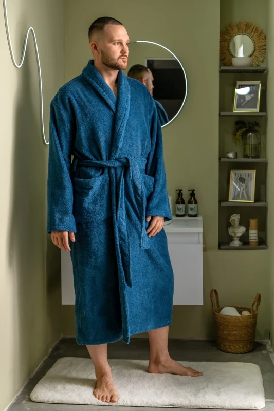 Состав: 100% хлопок Ткань: Махра Параметры модели на фото (рост, Ог-От-Об): 179, 106-94-111 Мужской халат из двустороннего махрового хлопкового полотна. Модель на запах, с поясом в шлёвках, с боковыми карманами, с воротником "шаль", с петлей-вешалкой по горловине спинки.
